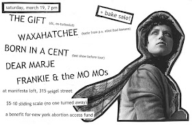 New York Abortion Access Fund provides assistance to low-income women seeking abortion. Hopefully you know about all the fucked up shit our government has been doing to hack away at reproductive rights lately, and hopefully you're doing something about it, whether signing a petition, donating to Planned Parenthood, getting involved with some sort of radical health collective, or something else. The Gift are an awesome band from DC featuring Turboslut front-lady Beck. Waxahatchee is Katie's current solo project (from P.S. Eliot and Bad Banana). Dear Marje are playing their second show, and they're just about the cutest band in Brooklyn. If you live here I hope you make it out!